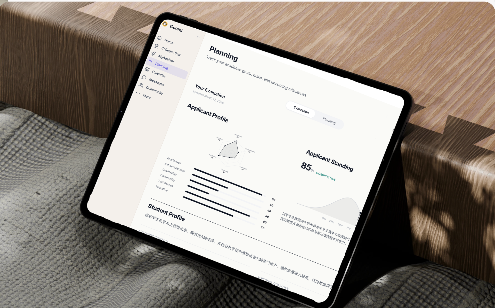 Seamless multilingual support. Use Goomi in English, Chinese, or Korean. Research colleges, chat with AI, and track progress — all in the language you think in.